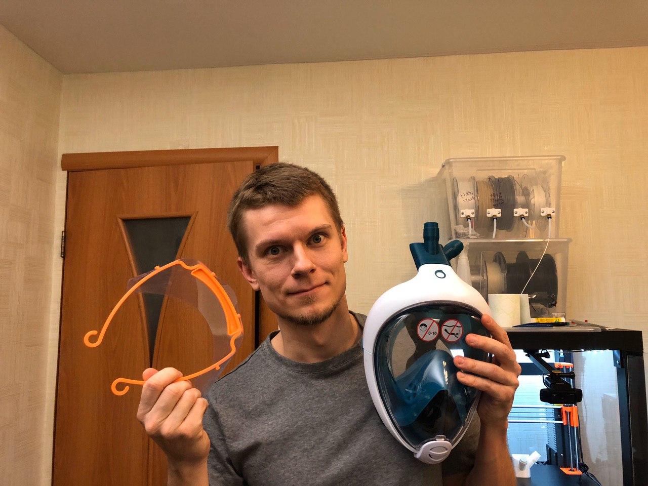 Александр связался со спортивными магазинами и нашел спонсоров, которые оказались готовы помочь мейкерам с материалами для печати, а также предоставить врачами снорклинговые маски. Мейкеры начали разрабатывать переходники, которые присоединяются к маскам, после чего на них надевают стандартные фильтры аппаратов для искусственной вентиляции легких. Также они начали производить маски-визоры, состоящие из двух частей: ободка, который надевается на голову, и пленки, которая крепится к ободку. Александр объясняет, что это позволяет врачам защититься от брызг и капель в лицо при проведении процедур пациентам, а также помогает избежать случайных прикосновений к лицу.