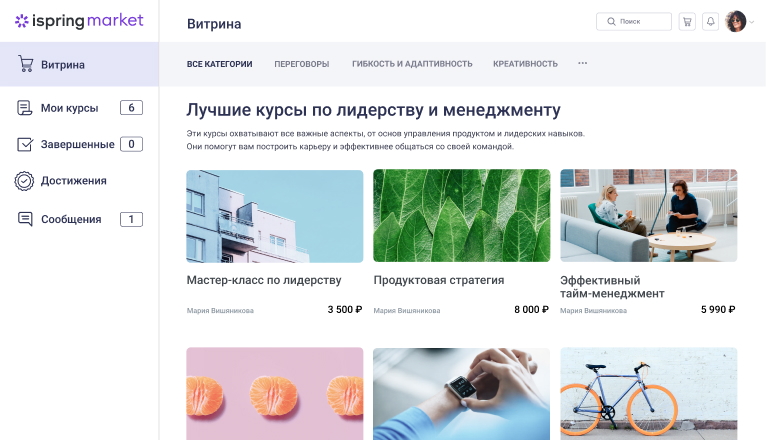 За показ доступных для прохождения курсов в iSpring Market отвечает так называемая витрина – специальная страница, на которой видны все ваши курсы.