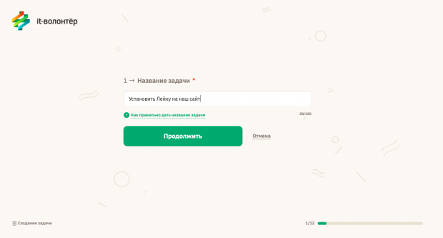 Если вы представитель НКО и ранее не обращались за помощью к специалистам через проект «IT-волонтер», зарегистрируйтесь на платформе. Опубликуйте задачу и опишите свой первый опыт постановки задачи.