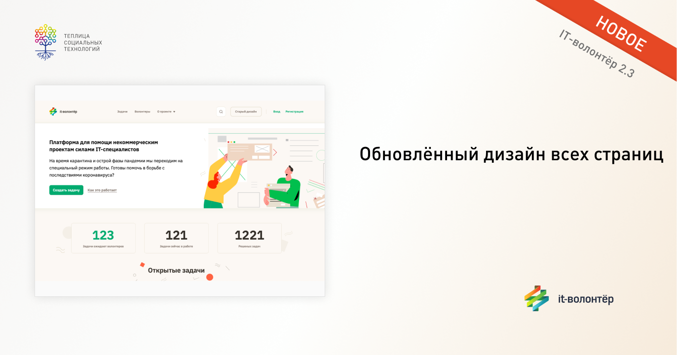 Команда разработки Теплицы социальных технологий полностью обновила дизайн страниц на платформе «IT-волонтер». Пользователи теперь могут ставить задачи или откликаться на них, используя новые функции, обновленные формы и страницы. Презентация нового дизайна прошла на ежегодной конференции «Сетевой сентябрь» 4 сентября 2020 года. Дизайн платформы обновлен впервые с 2017 года.
