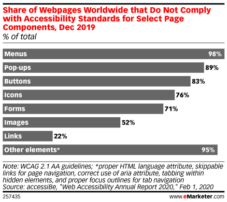 Ситуация с доступностью сайтов все еще не очень оптимистичная, причем не только в России, но и в мире. Как показывает Web Accessibility Annual Report (ежегодный отчет о доступности сети Интернет), по крайней мере 98% меню веб-сайтов, 89% всплывающих окон и 83% кнопок не соответствуют рекомендациям WCAG 2.1.