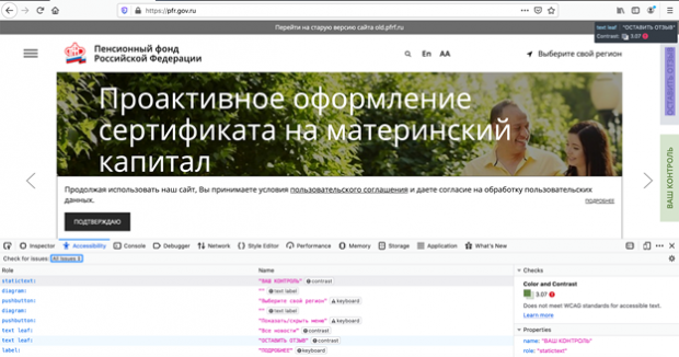 Вот так выглядят результаты проверки сайта Пенсионного фонда в Accessibility Inspector, встроенный в FireFox по умолчанию, проверяющий соответствие стандартам WCAG.