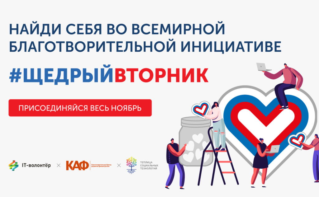 Теплица социальных технологий и проект IT-волонтер активно поддерживают инициативу #ЩедрыйВторник. Так, в 2019 году прошла мастерская «Как увеличить пожертвования: мастерская по подготовке к #ЩедромуВторнику для новичков». На ней специалисты помогали некоммерческим организациям подготовиться к проведению благотворительных акций.