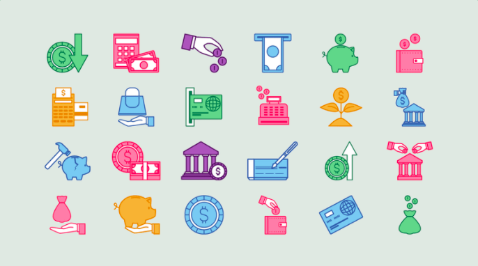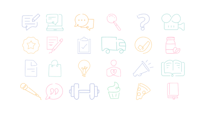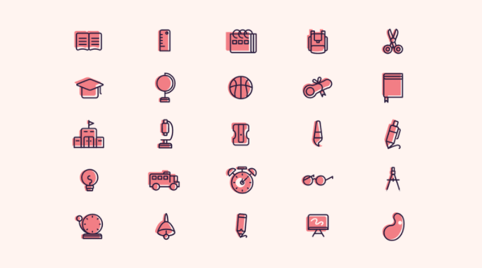 Если нравится лайн-арт, но нужно больше выразительности в цвете, присмотритесь к этому набору иконок с тонким контуром и слегка смещенной подложкой. Все цвета изменяемые.