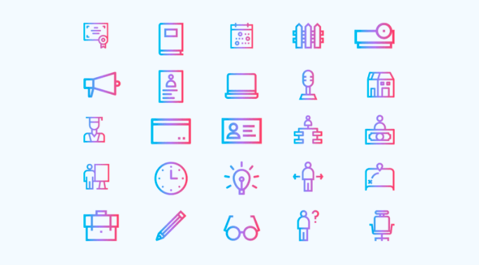 Необычный набор иконок с градиентным контуром. Подойдет для презентации на тему менеджмента и управления персоналом. Цвета в градиентах изменяемые. Отличный компромисс, когда нужны яркие акценты и простота в начертании.