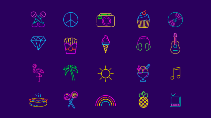 Яркие неоновые значки для презентаций выделят ваш дизайн. Их лучше размещать на темно-синем или черном фоне. Больше элементов из этой серии можно найти в Canva по запросу «Neon Illustration».