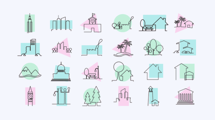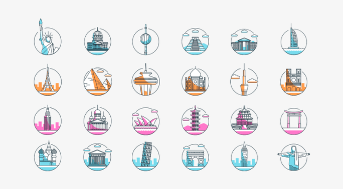 Эти стильные контурные иконки с частичной заливкой подойдут для доклада о путешествиях или квиза. Проверьте себя: сколько городов вы сможете узнать по упрощенным изображениям их достопримечательностей?