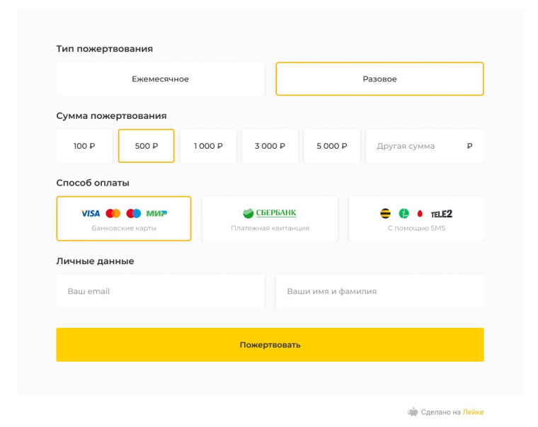 В форму пожертвований добавлена надпись «Сделано на «Лейке». Во-первых, это красиво. Во-вторых, мы бы хотели, чтобы как можно больше людей знали, что с помощью «Лейки» удобно собирать онлайн-пожертвования.