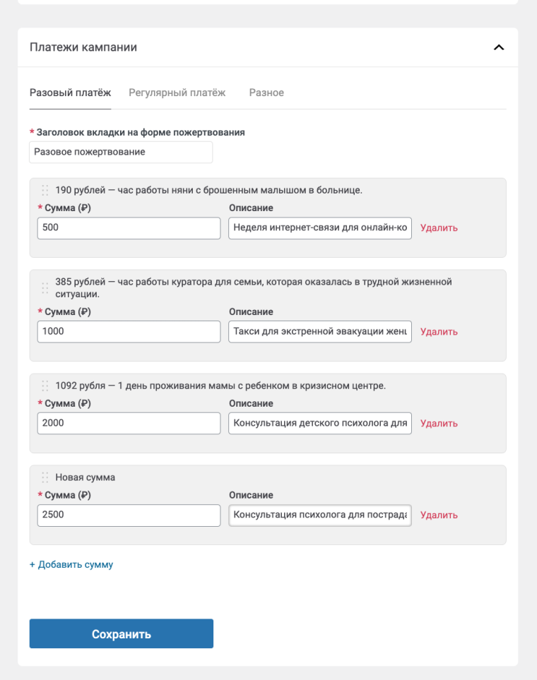 Суммы и подписи к ним можно настраивать из административной панели «Лейки» в разделе «настройки», далее «вид кампании». Плагин позволяет настраивать разные варианты сумм для разовых и регулярных пожертвований, глобально — для всех кампаний сразу и отдельно — для каждой кампании.