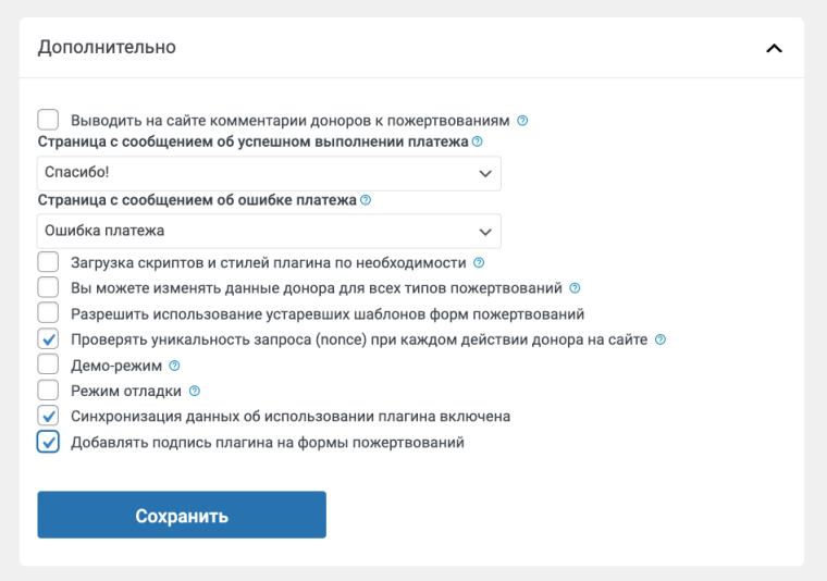 Надпись добавляется в форму пожертвований по умолчанию для новых установок. Отключить ее можно в настройках плагина в разделе «Разработчикам», вкладка «Дополнительно», пункт «Отображать подпись платформы на формах пожертвования».