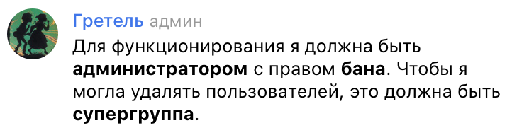 - Назначьте «Гретель» администратором чата с возможностью удалять участников.