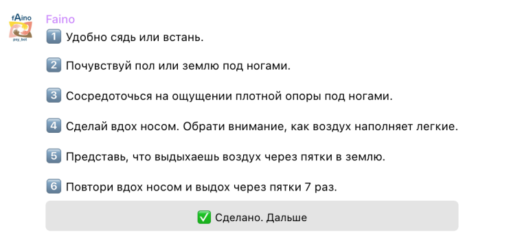 Чат-бот работает на четырех языка — украинском, русском, беларуском и английском. Сам бот похож на приложения, помогающие справляться с паническими атаками. Несколько лет назад в стрессовые периоды несколько таких приложений с практиками медитаций были у меня на телефоне, но открыть их в нужное время никогда не получалось. Faino предлагает методики самопомощи и будто беседует с разными интонациями в зависимости от указанного тобой уровня стресса. Получается практически переписка с психотерапевтом.