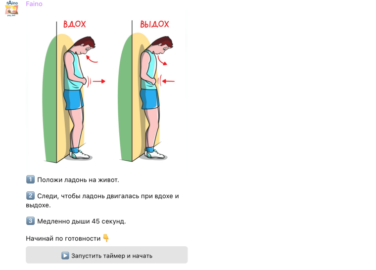 При невысоком уровне стресса бот спокойно объясняет тебе, что ты можешь управлять своим состоянием, для этого достаточно следовать определенным шагам, а потом предлагает упражнения и техники. При самом высоком уровне стресса беседа совсем другая — бот говорит, что тебе делать, запускает таймер для выполнения этих действий.