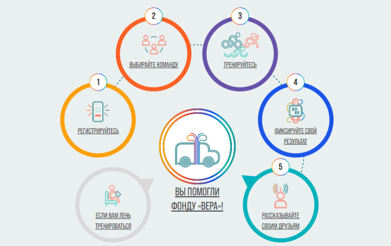 Участникам нужно было присоединиться к одной из команд, тренироваться в плавании, беге или велоспорте, фиксировать свои успехи в приложении Strava и предлагать друзьям поддержать себя, сделав пожертвование. Генеральный спонсор проекта «Лаборатория Касперского» удвоила самую большую сумму из собранных командами. По итогам события участники триатлона собрали почти 2 млн рублей для работы четырех выездных служб помощи фонда «Вера».