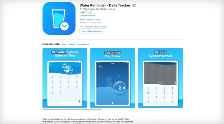 Приложение, основная функция которого — напоминать о питье воды в течение дня. Пользователям нужно указать свой пол и вес. Приложение рассчитает, сколько воды им надо пить в день, и будет ежедневно напоминать это делать. Можно отмечать, сколько воды выпито, отслеживать историю ее потребления и таким образом выработать у себя полезную привычку.