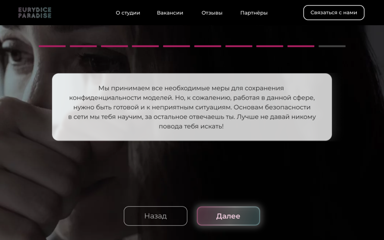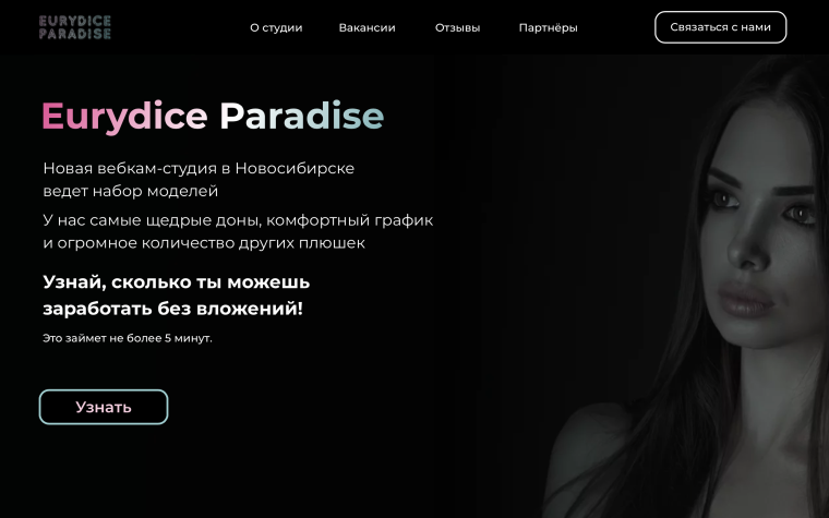 «Высокооплачиваемая работа для девушек от 18 лет без опыта», «брачные агентства», «массажные салоны» — под такими предлогами вебкам-студии ищут и привлекают в «бизнес» новых участниц. Женщины переходят на вакансии и попадают на сайты, где им обещают высокую зарплату, удобный график и «безобидные» обязанности. Правда, обещания не становятся реальностью: сексуализированная эксплуатация негативно влияет на физическое и психическое состояние пострадавшей. Именно о том, что на самом деле скрывается за вовлекающими преимуществами вебкама, рассказывает проект «Эвридика», создавший сайт, притворяющийся лендингом вебкам-студии.