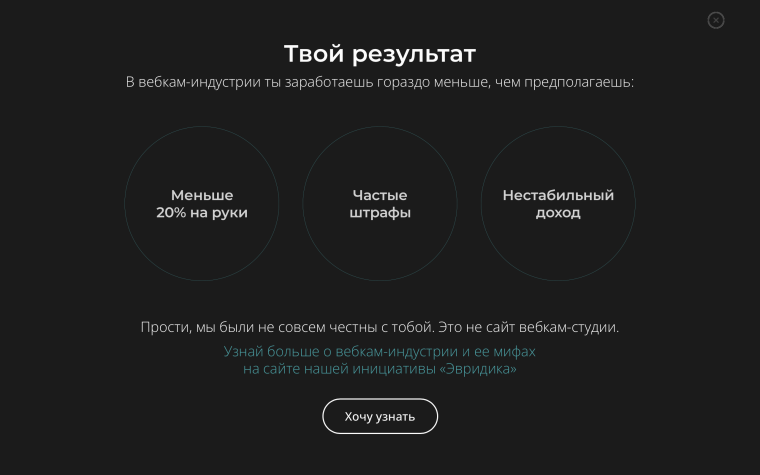 Чтобы сайт проекта выглядел «естественно», участницы «Эвридики» проанализировали десяток сайтов реальных вебкам-студий. У них они переняли жанр теста — этот прием часто используют сутенеры, чтобы мотивировать девушек оставить свои контактные данные в конце квиза. Но в «Эвридике» вопросы и ответы аккуратно наводят посетительниц на мысли о неприглядных сторонах работы — однако не прямолинейно, чтобы не отпугнуть.