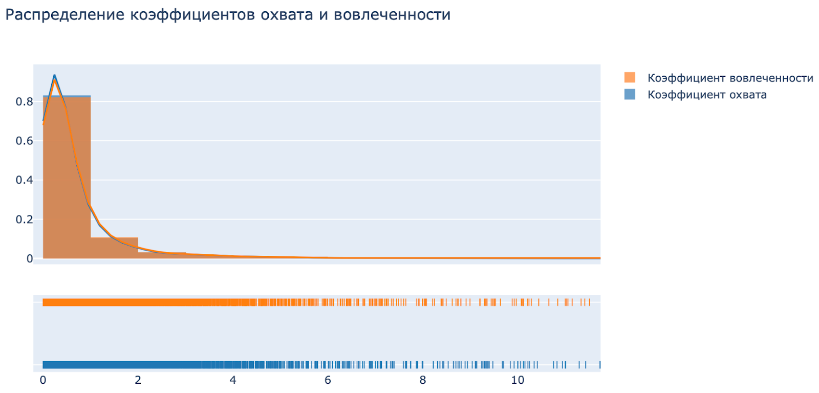 То, каким образом считается коэффициент вовлеченности пользователей и коэффициент охвата постов, может отличаться по разным соцсетям в зависимости от того, какие виды взаимодействия с аудиторией там доступны. Проще всего с коэффициентом охвата постов, так как количество просмотров поста и количество подписчиков доступно практически везде и ВКонтакте не исключение. Тогда коэффициент охвата – это количество просмотров, деленное на количество подписчиков. Эта цифра показывает нам, насколько эффективно группа работает со своими подписчиками, а не только эффективность конкретного поста, которая обычно оценивается просто как количество просмотров, без деления на количество подписчиков. Если этот коэффициент от 0 до 1, значит, посты группы смотрят меньше людей, чем количество их подписчиков, то есть посты мало репостят и аудитория не слишком активная. Если коэффициент охвата больше 1, значит, посты просматривают не только подписчики группы, их репостят/лайкают, они попадают в ленту к другим аудиториям. Но при этом, если у группы очень мало подписчиков, то коэффициент охвата может быть высоким, а на практике это будет значить, что посты просматривают, например, только 5 человек. Поэтому мы исключили из анализа группы, у которых меньше, чем 100 подписчиков, как для анализа коэффициента охвата, так и для анализа второй метрики – коэффициента вовлеченности.