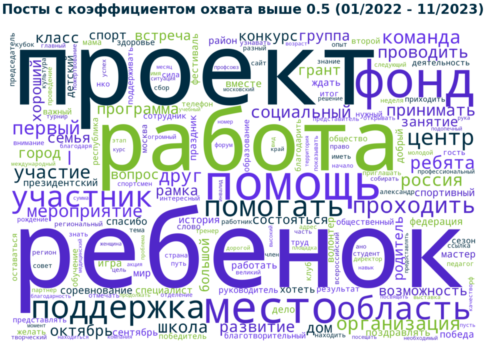 В самых эффективных по коэффициенту охвата постам всё ещё много постов про помощь детям. Выше поднялось слово «спорт». Судя по всему, в этой группе постов больше позитивной лексики в топе – «любовь», «вместе», «хороший», «друг», «мир». При этом внезапно на этом облаке есть слово «война», несмотря на то, что в этой выборке нет антивоенных или явно милитаристских организаций. Еще заметно, что в этих облаках немало канцелярской лексики, но в последнем облаке слов с самыми высокоэффективными постами, такой лексики немного меньше. Интересно, что посты со словами «Россия» и «РФ» в среднем имеют коэффициент охвата на 3% ниже, чем посты без.