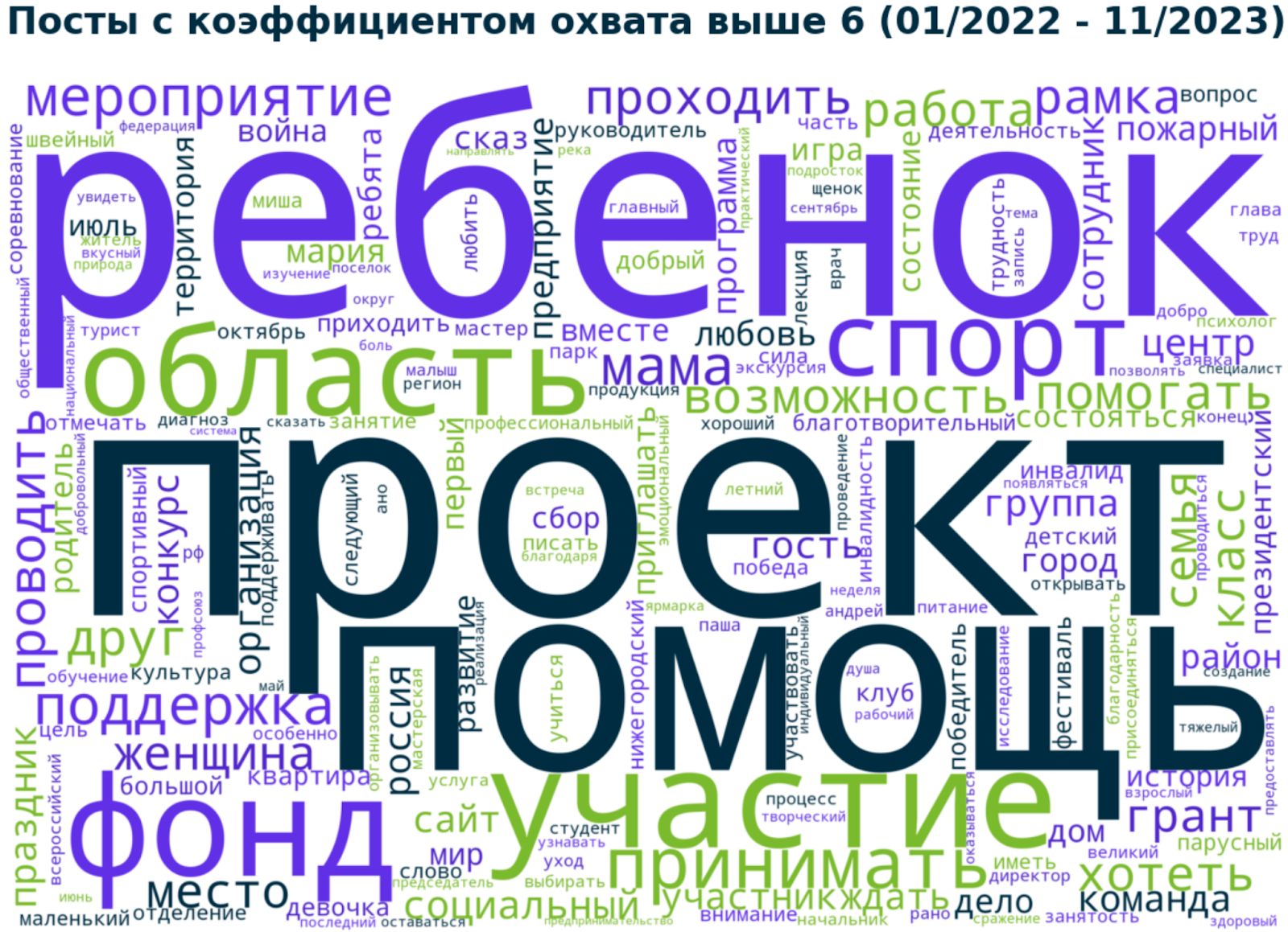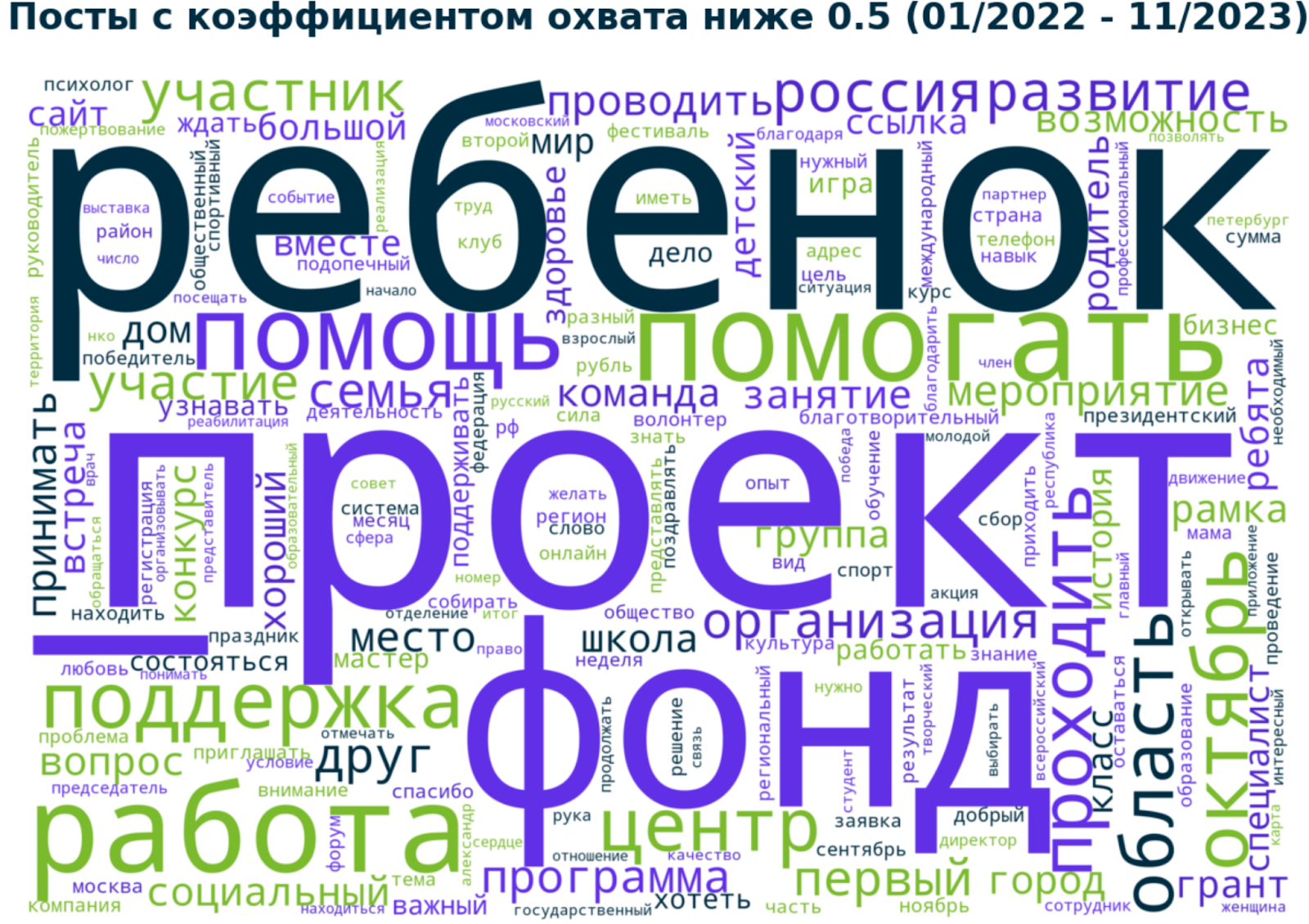 В обеих группах очень часто фигурируют слова «проект» и «ребенок», и облака слов в целом довольно-таки похожи друг на друга. И в той, и в другой группах много слов, похожих на слова из отчетов о мероприятиях или из анонсов – «мероприятие», «проходить», «участник», «принимать», «проводить», «состояться», «участие» и т.д. В постах с низким коэффициентом охвата чаще встречается слово «фонд». Это, возможно, потому, что с со словом «фонд» чаще делают отчетные или обязательные материалы, которые не так вдохновляют их авторов, как искренние рассказы об успехах или проблемах подопечных, но это только наша гипотеза.
