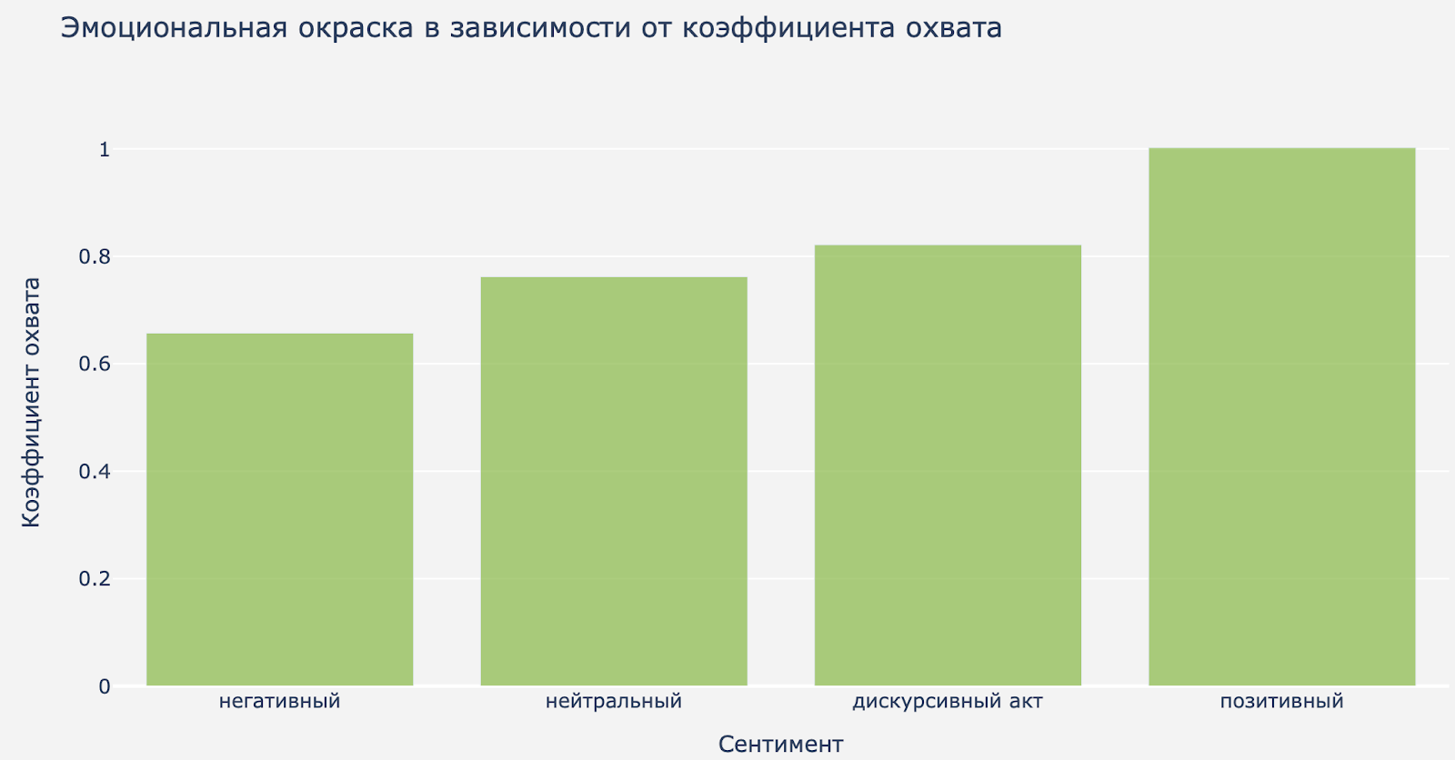 Что касается сентимента, коэффициенты вовлеченности и охвата постов ВКонтакте наиболее высокие для позитивно-окрашенных постов. На втором месте по коэффициентам вовлеченности и охвата посты типа «дискурсивный акт», то есть такие посты, которые могут содержать призывы, обращения и т.д. Потом идут нейтральные посты. Негативно-окрашенные посты имеют наименьшие коэффициенты охвата и вовлеченности, что ожидаемо.