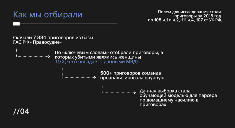 Проект «Алгоритм света», который стал финалистом хакатона Теплицы и Новой газеты Прожектор в 2021 году, применяет машинное обучение для анализа судебных решений. С помощью алгоритма градиентного бустинга проект обрабатывает данные из судебных документов, анализируя массивы судебных решений, и выявляет случаи домашнего насилия. Несмотря на отсутствие в России такой статьи в административном или уголовном кодексе, алгоритмы ИИ позволяют идентифицировать случаи домашнего насилия по косвенным признакам и формулировкам в текстах решений. В ходе анализа 81 136 приговоров, вынесенных с 2011 по 2019 год, выяснилось, что 66% женщин, ставших жертвами убийств, были убиты в результате домашнего насилия. Это позволяет адвокатам и исследователям получать доступ к критически важной информации, которая может помочь в защите жертв домашнего насилия и адвокации по изменению законодательных инициатив.