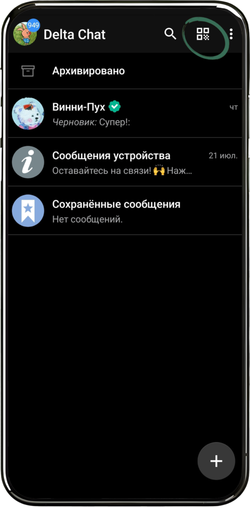 Delta Chat поддерживает сквозное шифрование групповых чатов. Чтобы создать чат, достаточно нажать на плюсик на главной странице мессенджера.