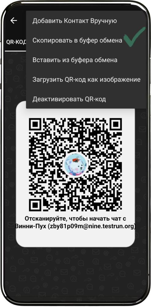 - Скопировать вместо QR-кода инвайт-код. Его можно найти в том же меню. Далее этот инвайт-код вы можете переслать в другом защищенном мессенджере;