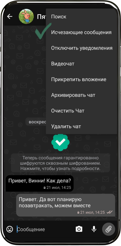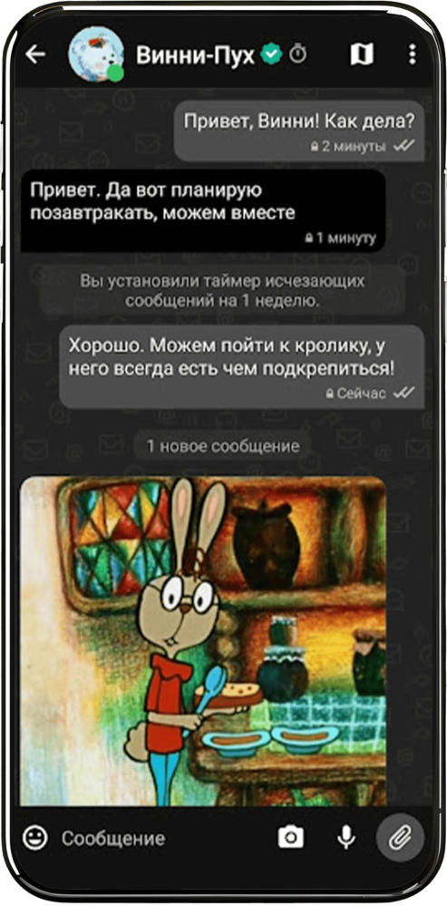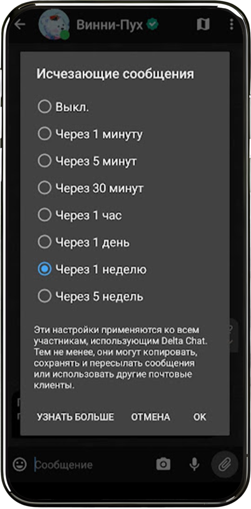 В каждом чате мы рекомендуем сразу же выставить таймер исчезающих сообщений.