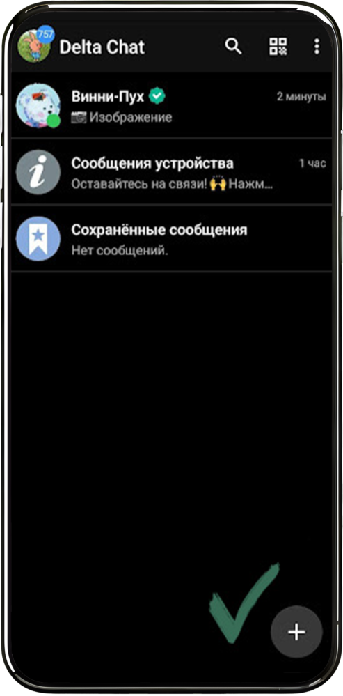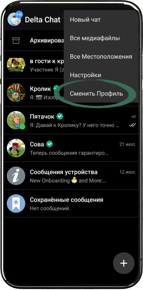Когда вы создали профиль и вошли в Delta Chat, вы можете кастомизировать мессенджер.