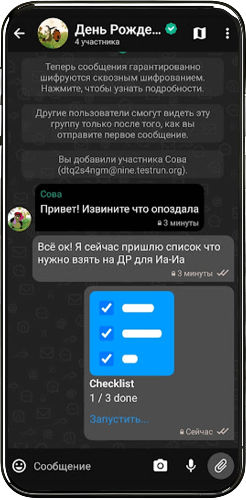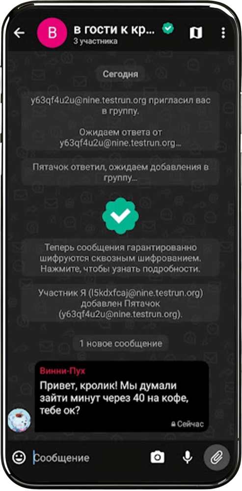 Допустим, вы создали профиль для организации Дня рождения Иа-Иа: [email protected]. Сделайте бэкап аккаунта и поделитесь им с коллегами. Вы окажетесь внутри общего профиля, где можно создавать отдельные чаты (как ветки на форуме), использовать приложения, общаться. Для внешнего наблюдателя это выглядит как шифрованная переписка человека с самим собой, что позволяет минимизировать слив метаданных.