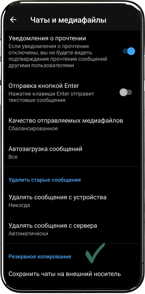 Чтобы сделать бэкап ваших чатов и ключей, найдите в меню «Чаты и медиафайлы» и выберите «Сохранить чаты на внешний носитель». Обычно бэкап имеет имя вида «delta-chat-backup-ГГГГ-ММ-ДД-00-ваш-имэйл.tar». При желании, файл можно перенести на внешний носитель.