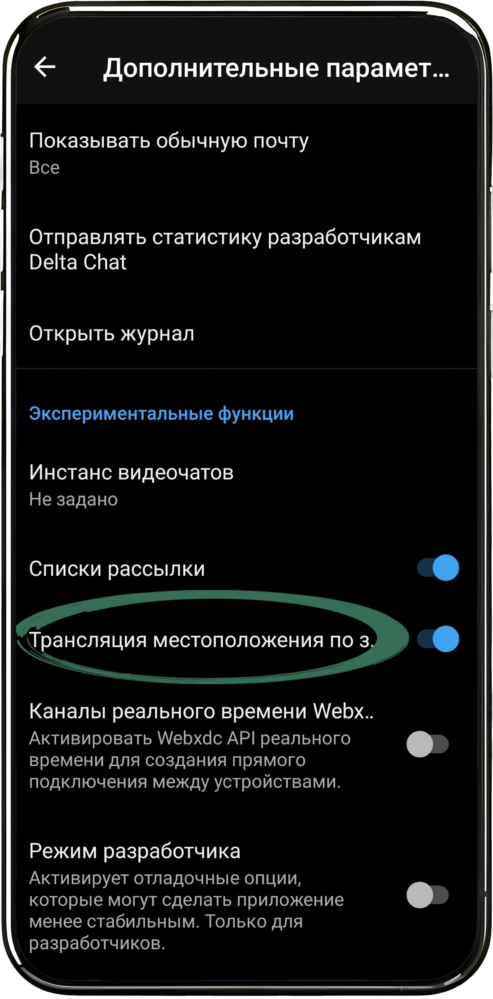 Чтобы включить возможность делиться локацией, нужно дать разрешение в дополнительных настройках.