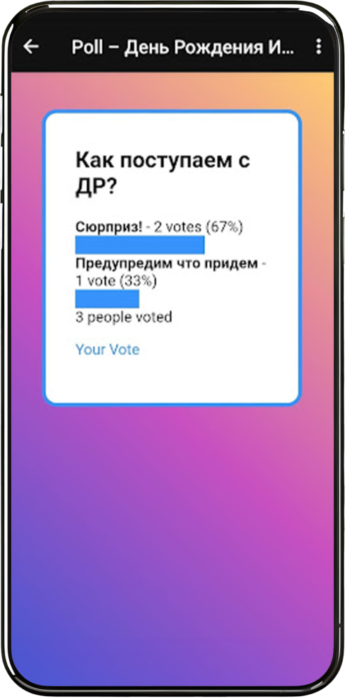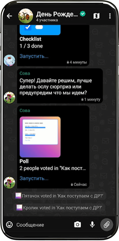 - Встроенные приложения: можно редактировать документы, отслеживать выполнение задач, создавать опросы и играть в тетрис, не покидая интерфейс мессенджера.