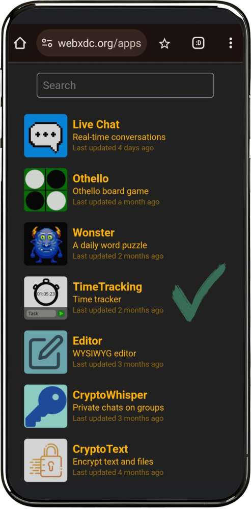 Delta Chat поддерживает множество встроенных приложений для командной работы – от календаря, чек-листа и опросов до текстового редактора, таск-трекера и даже игр. Эти приложения называются webxdc (веб-экс-ди-си). Они открываются изнутри Delta Chat, не требуют регистрации и не зависят от сторонних серверов. Как и переписка в Delta Chat, данные в этих приложениях защищены сквозным шифрованием. Чтобы развернуть полноценную рабочую среду для организации, можно заранее прикрепить нужные приложения в ваши рабочие чаты.