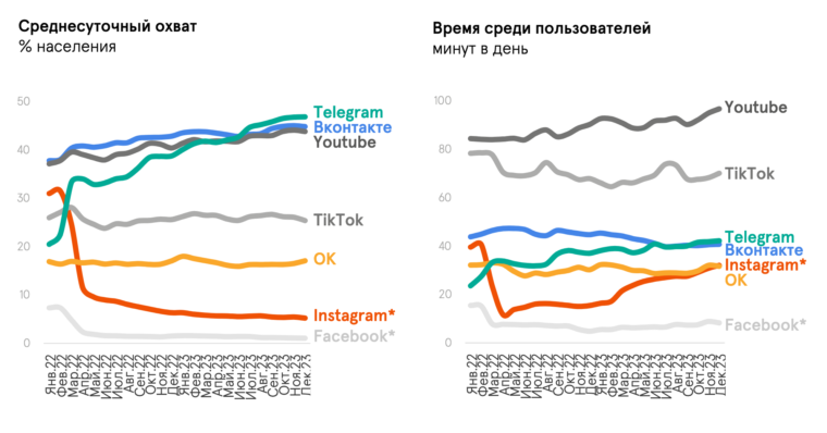 Telegram, некогда просто мессенджер, стал платформой с одной из самых больших аудиторий в России. По данным Mediascope, дневная аудитория Telegram с января 2022 по август 2024 года выросла более чем вдвое (с 20% до 51% населения России старше 12 лет), превратив его в самую популярную соцсеть в стране. Причем Telegram сильно отличается по тематике — в отличие от других площадок, более половины (58%) потребляемого контента посвящено новостям и политике. Это подтверждается и данными опросов: Telegram стал вторым после телевидения источником новостей для россиян по уровню доверия.