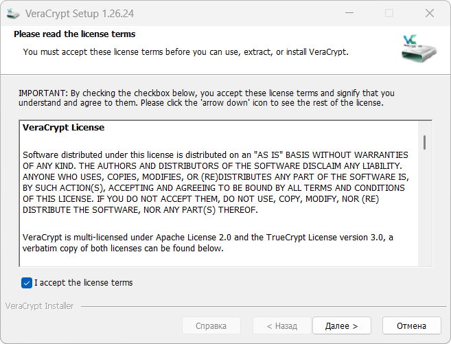 Любопытно, что VeraCrypt снова предлагает выбрать между устанавливаемой и портативной версиями.
