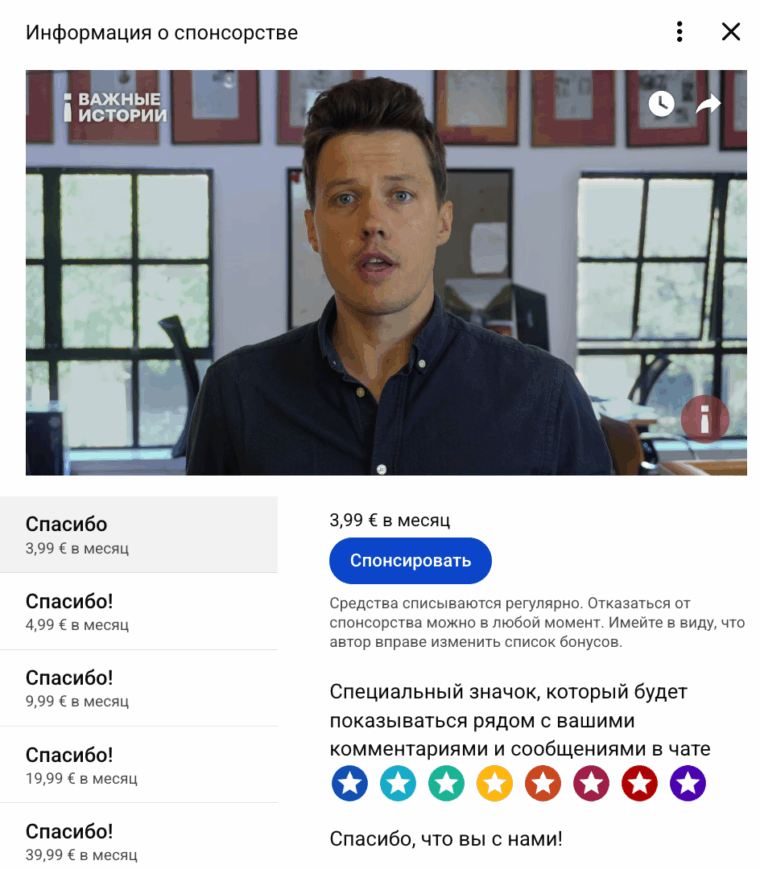 После этого вы получите YouTube-канал с настроенным AdSense, который сможет получать платежи от подписчиков из любых стран мира (кроме РФ и РБ). YouTube предлагает для этого функцию разовых донатов «Суперспасибо» (требования для подключения описаны здесь) и YouTube Memberships (платные подписки на канал). Пример оформления этих функций можно посмотреть в YouTube-канале «Важных историй».