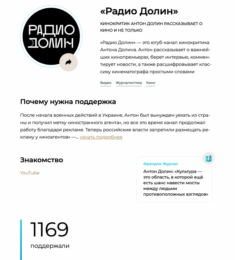 Молодой сервис Френдли (Friendly2.me) «для поддержки творческих людей» можно рассматривать как инди-альтернативу Boosty: на их платформе уже собирают донаты Антон Долин, Илья Яшин, Павел Каныгин («Продолжение следует»), «Гласная» и другие люди и медиа с яркой гражданской позицией.