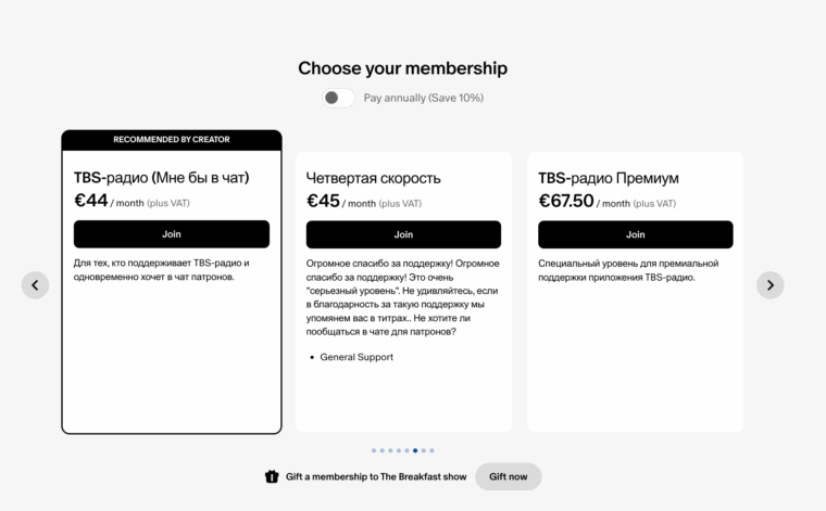 Patreon — мировой лидер в этой нише, его комиссия составляет около 10% с каждого доната. Но сайт patreon.com заблокирован Роскомнадзором три года назад и доступен в стране только через VPN. Тем не менее, русскоязычные медиа и НКО в изгнании даже сейчас вполне успешно собирают там пожертвования: например, YouTube-журналист Александр Плющев имеет 1699 Patreon-подписчиков (часть из которых, впрочем, может быть на free-тарифе).