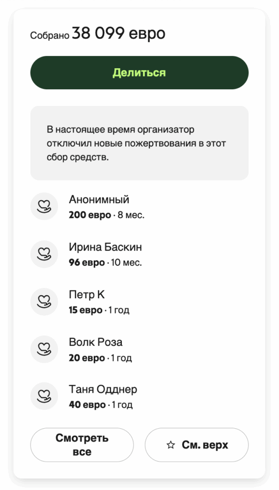 Существует еще GoFundMe — главная американская краудфандинг-платформа. Если у вас вдруг есть некоммерческая организация, официально зарегистрированная в США, Канаде, Великобритании, Ирландии и Австралии, то вы cможете запустить сбор пожертвований на gofundme.com. Телеканал «Дождь», например, в важный момент смог собрать через этот сервис 38 тысяч евро.