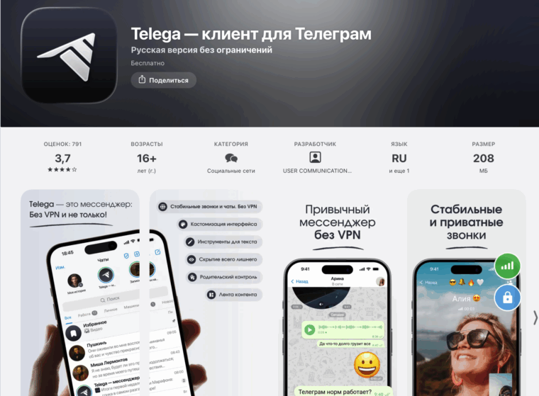 В октябре 2025 года в российских магазинах приложений стремительно набирает популярность Telega — неофициальный клиент для Telegram, обещающий обход блокировок звонков без VPN. Особенно он стал популярен в регионах Кавказа, где Telegram глушат особенно сильно.