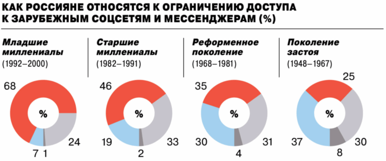 Как россияне относятся к происходящему с интернетом? Опрос за ноябрь 2025 показывает, что 68 % россиян, родившихся после 1992 года, — то есть молодые люди, «скорее не поддерживают» блокировку иностранных соцсетей и мессенджеров (при этом нужно учесть, что опрос проводил прокремлевский ВЦИОМ).