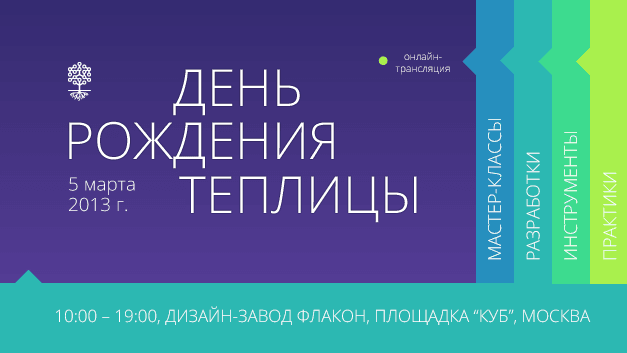 5 марта 2013, 10:00 – 19:00, дизайн-завод «Флакон» (Москва). Теплица социальных технологий приглашает на свой день рождения: нам исполнился год! И отметить это событие мы хотим по-особому: мы организуем целый день мастер-классов на темы, связанные с информационными технологиями для гражданского сектора, о которых мы писали и над которыми работали в течение прошедшего года.