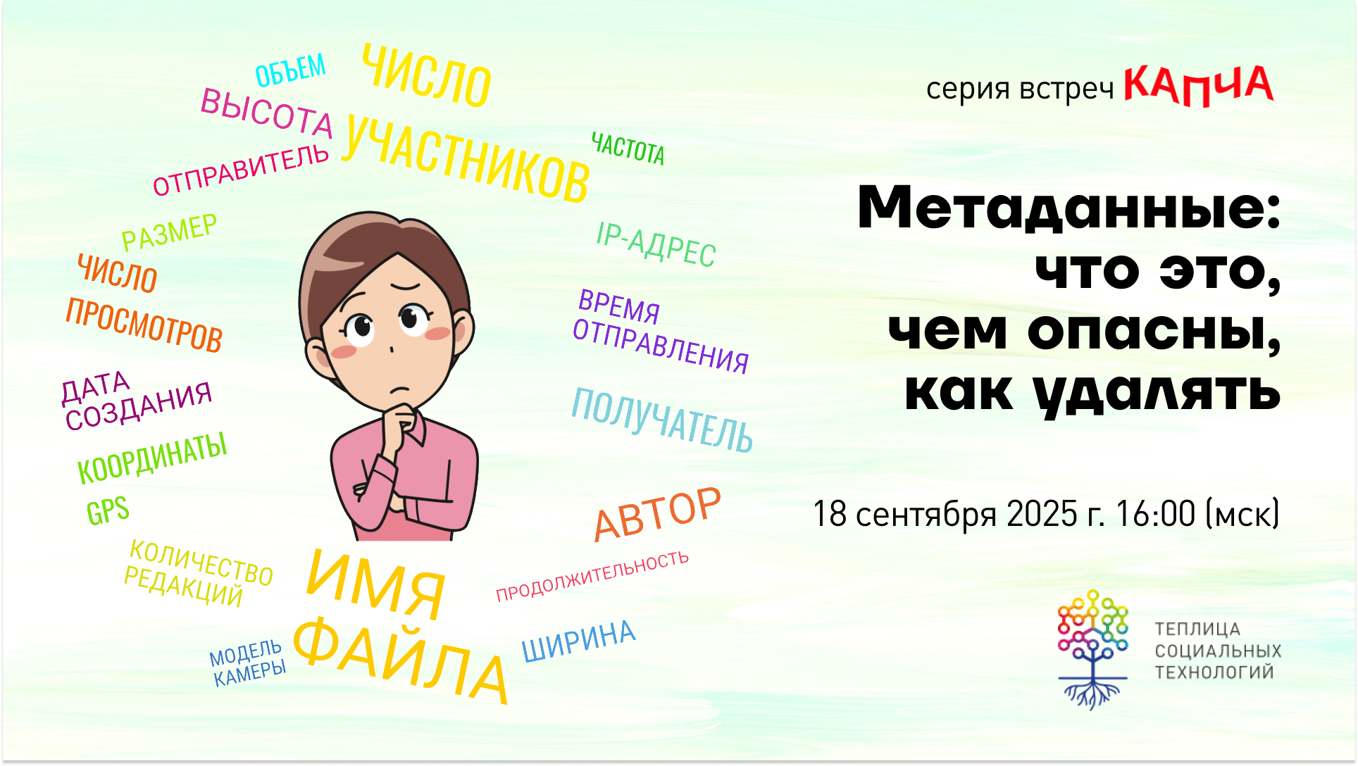 18 сентября 2025 года в 16:00 (GMT+3) Теплица социальных технологий проводит интерактивную встречу «Метаданные: что это, чем опасны, как удалять». Мероприятие адресовано гражданским активистам, журналистам, волонтерам и всем, кто обеспокоен вопросами цифровой безопасности как в России, так и в других странах.