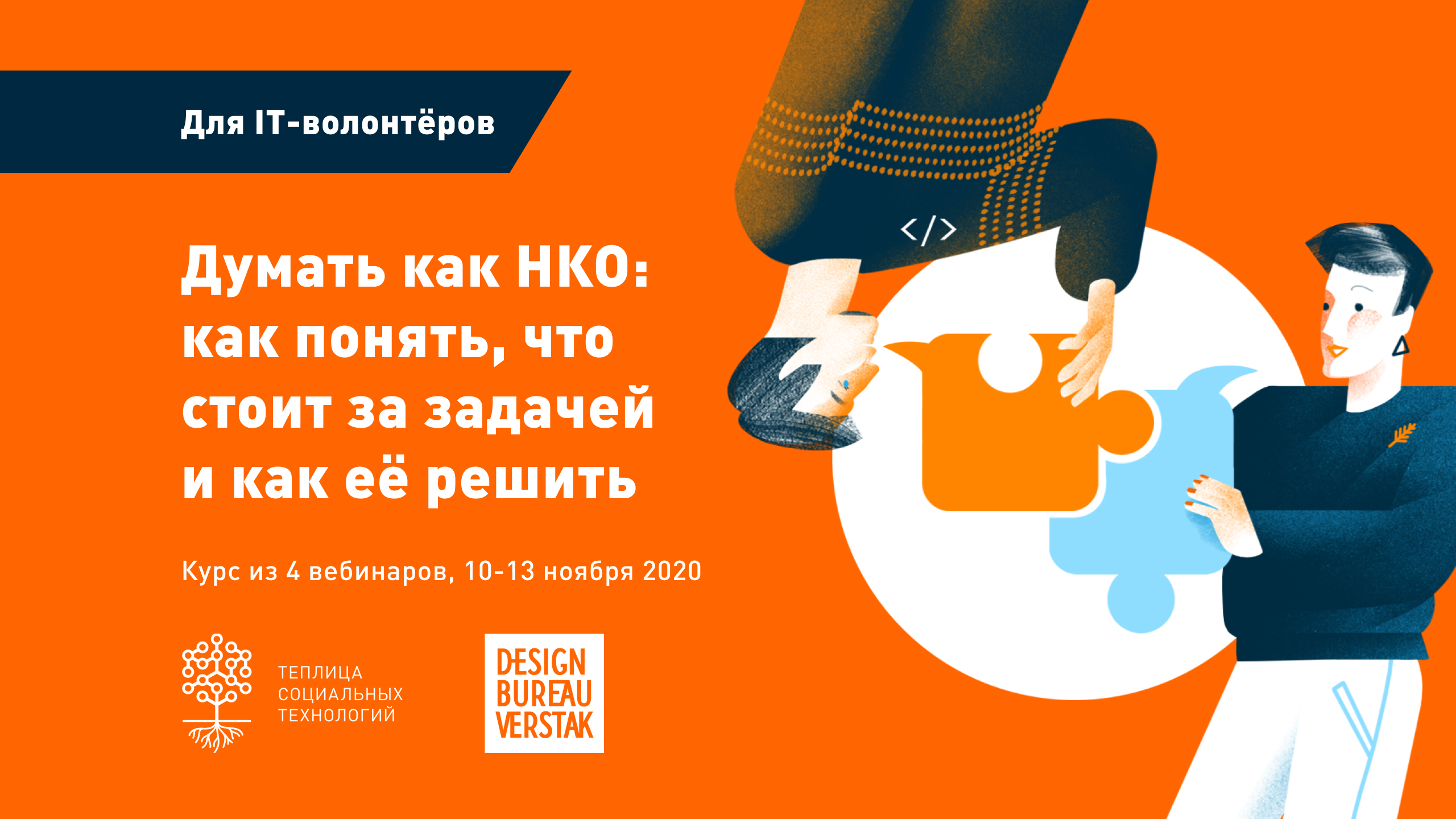 Команда Теплицы социальных технологий и дизайн-бюро «Верстак» приглашают веб-разработчиков, дизайнеров, маркетологов, smm-специалистов, помогающих некоммерческим организациям, принять участие в онлайн-курсе «Думать как НКО: как понять, что стоит за задачей, и как ее решить». Онлайн-курс пройдет 10-13 ноября 2020 года.