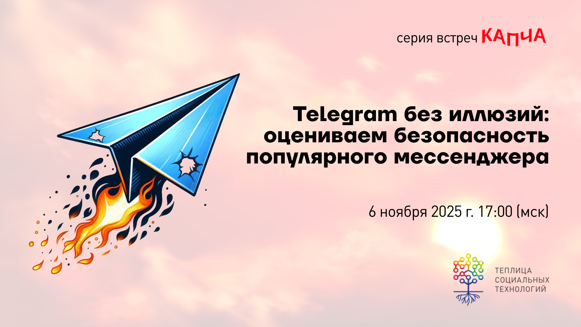 (регистрация закрыта) 6 ноября 2025 года в 17:00 (GMT+3) Теплица социальных технологий проведет встречу из серии «Капча» по теме «Telegram без иллюзий: оцениваем безопасность популярного мессенджера». Мероприятие адресовано гражданским активистам, журналистам, волонтерам и всем, кто обеспокоен вопросами безопасности как в России, так и в других странах.