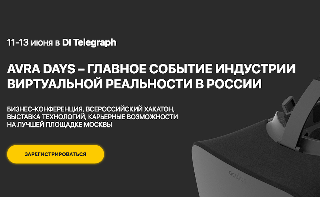 С 11 по 13 июня 2016 года Ассоциация дополненной и виртуальной реальности и DI Telegraph проведут AVRA DAYS – бизнес-форум и всероссийской хакатон, посвященные технологии виртуальной реальности.