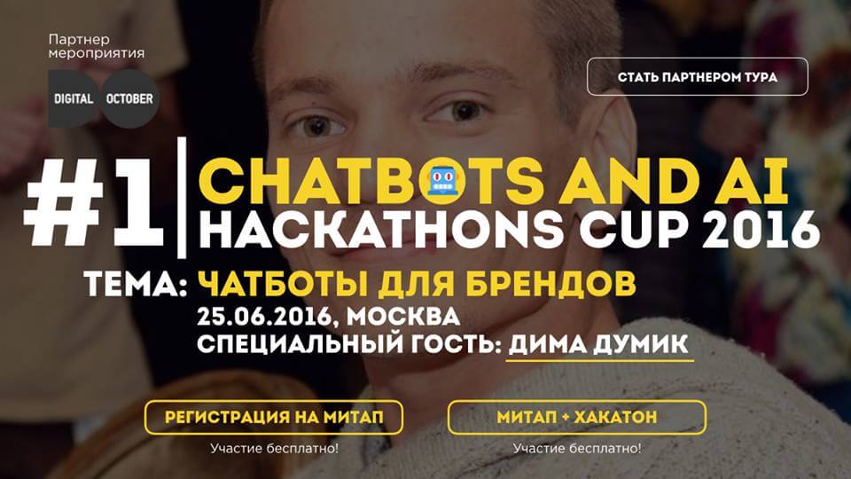 - хакатон: Первый тур чемпионата Chatbots Hackathons Cup 2016.