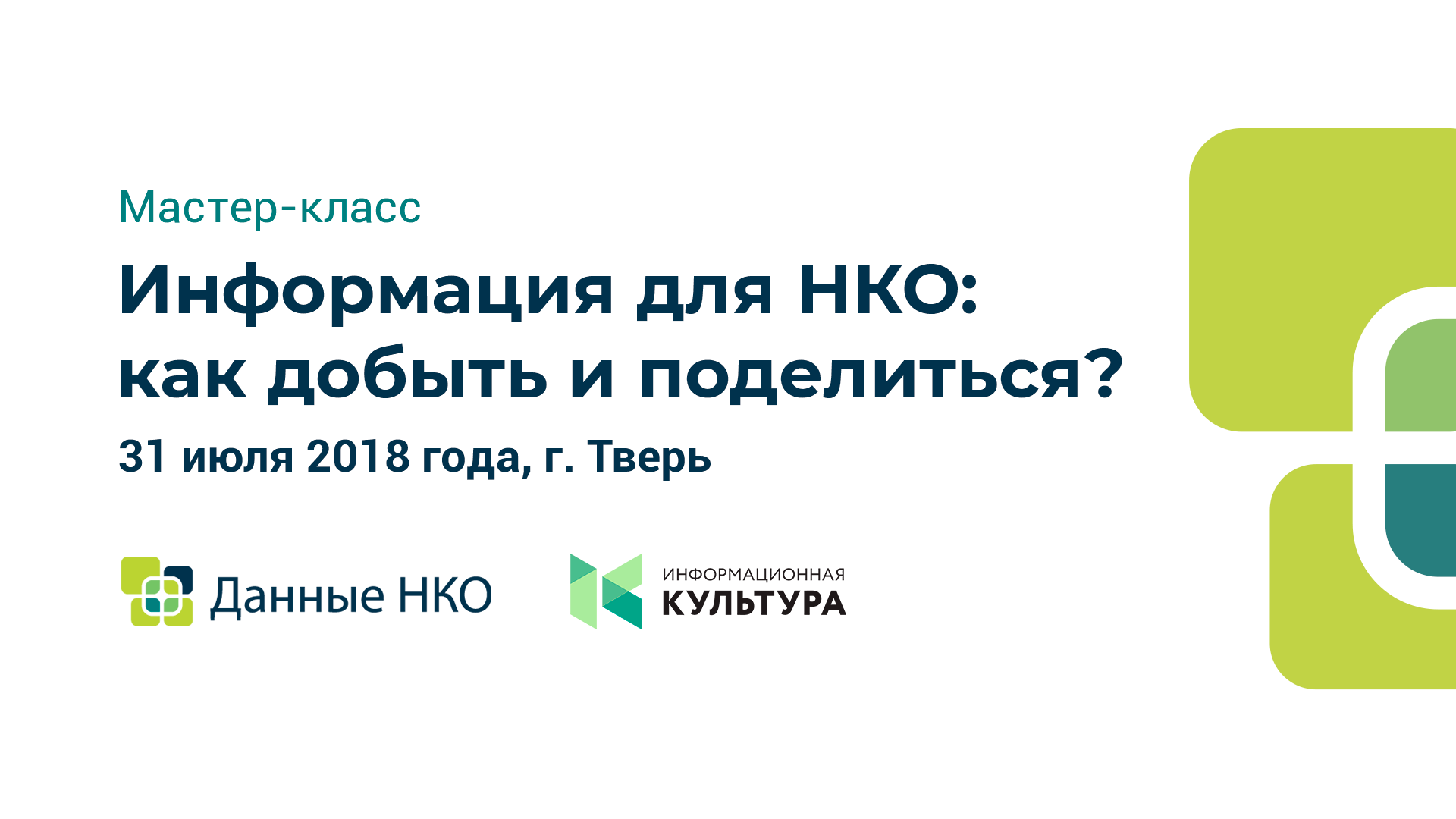 31 июля 2018 года автономная некоммерческая организация «Инфокультура» и ресурсный центр НКО Твери проведут мастер-класс «Информация для НКО: как добыть и поделиться?».